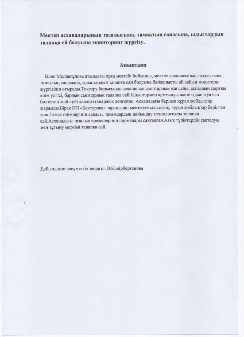 Асхананың тазалығын , тамақтың сапасын зерделеу анықтамасы » "Әлия Молдағұлова атындағы орта мектебі" КММ