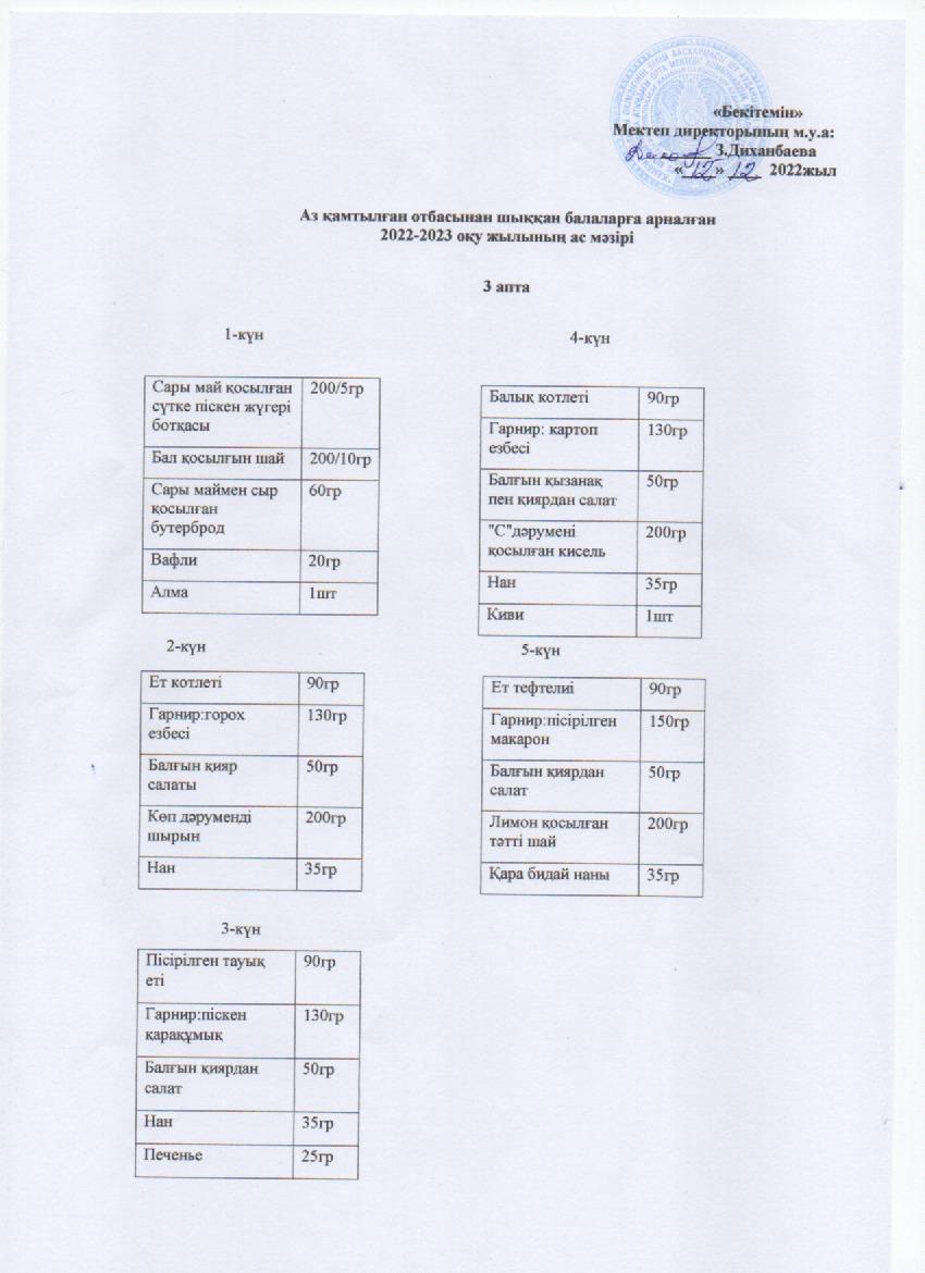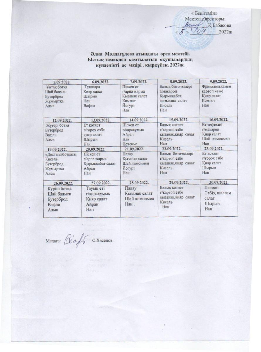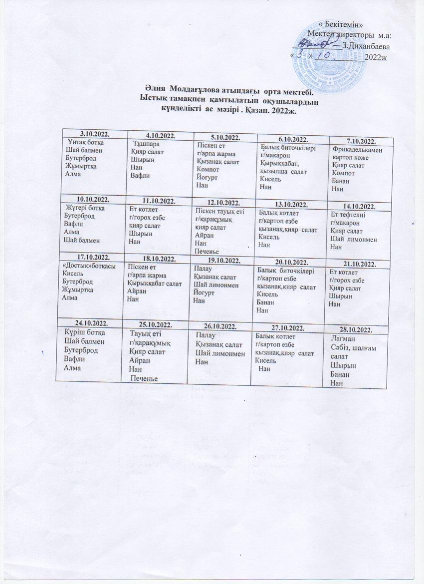 Ыстық тамақ ас мәзірі . 2022 ж » "Әлия Молдағұлова атындағы орта мектебі" КММ