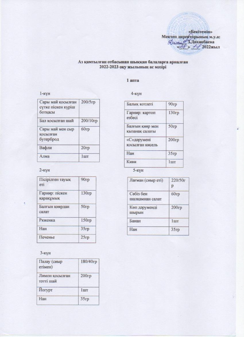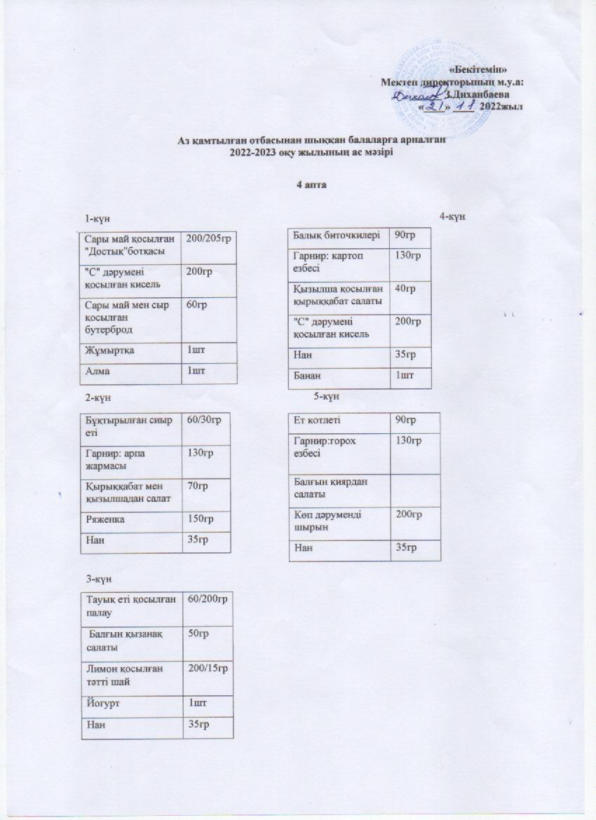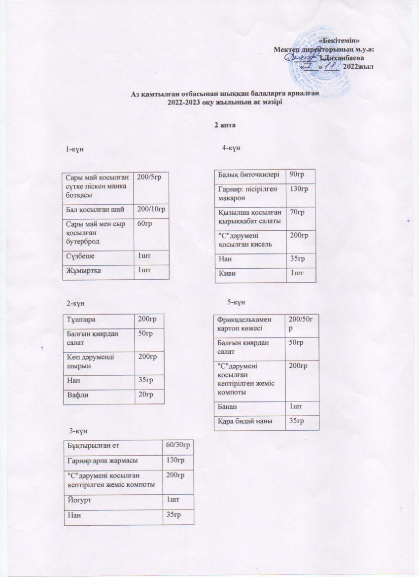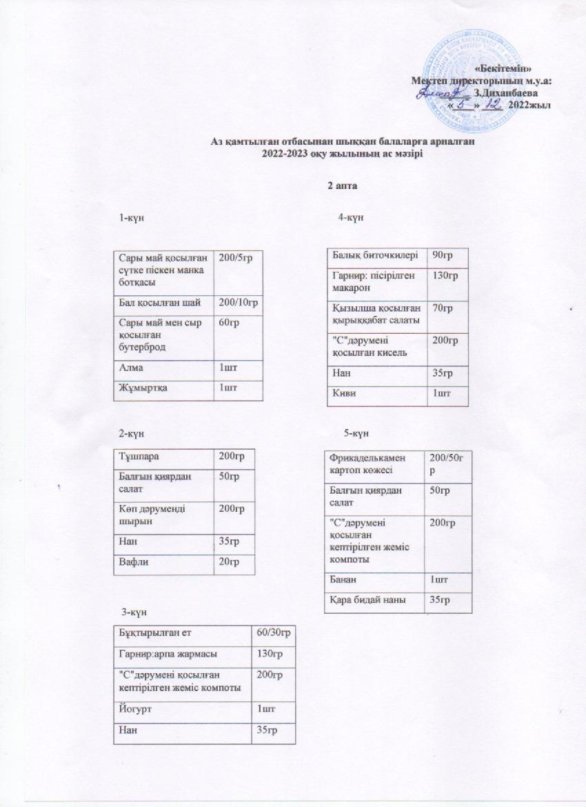 Ыстық тамақ ас мәзірі . 2022 ж » "Әлия Молдағұлова атындағы орта мектебі" КММ
