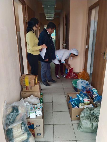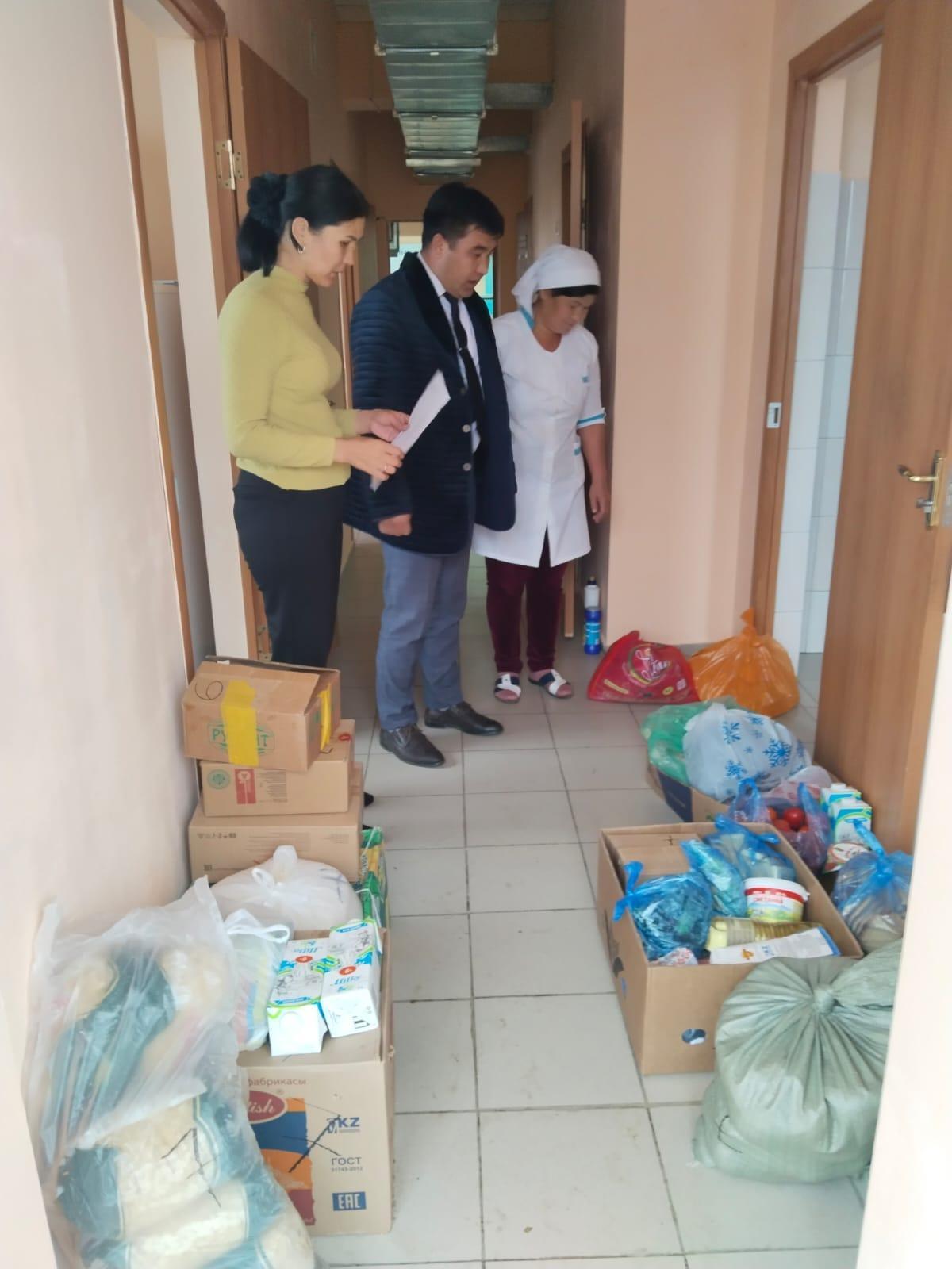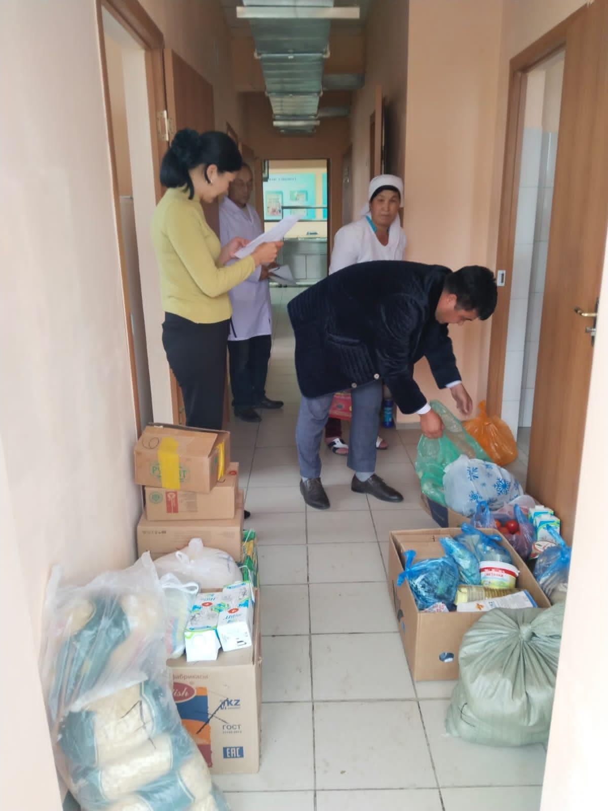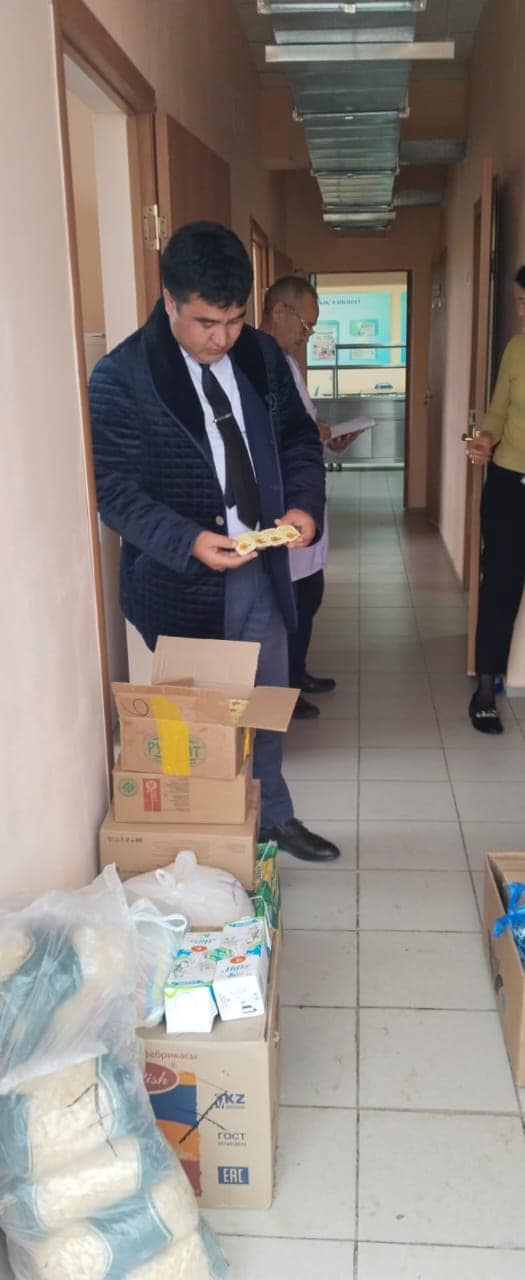 Әлия Молдағұлова атындағы орта мектебінде бракеражды комиссия мүшелері мектеп директоры А. Тогузаков, тәрбие орынбасары Ш. Илкибаева, медаға С. Хасенов, әлеуметтік педагог Ә. Кәдірбергенова ыстық тамақпен қамтылған балаларға арналған азық-түлікті «ИП «Сабировтан» қабылдау сәті.