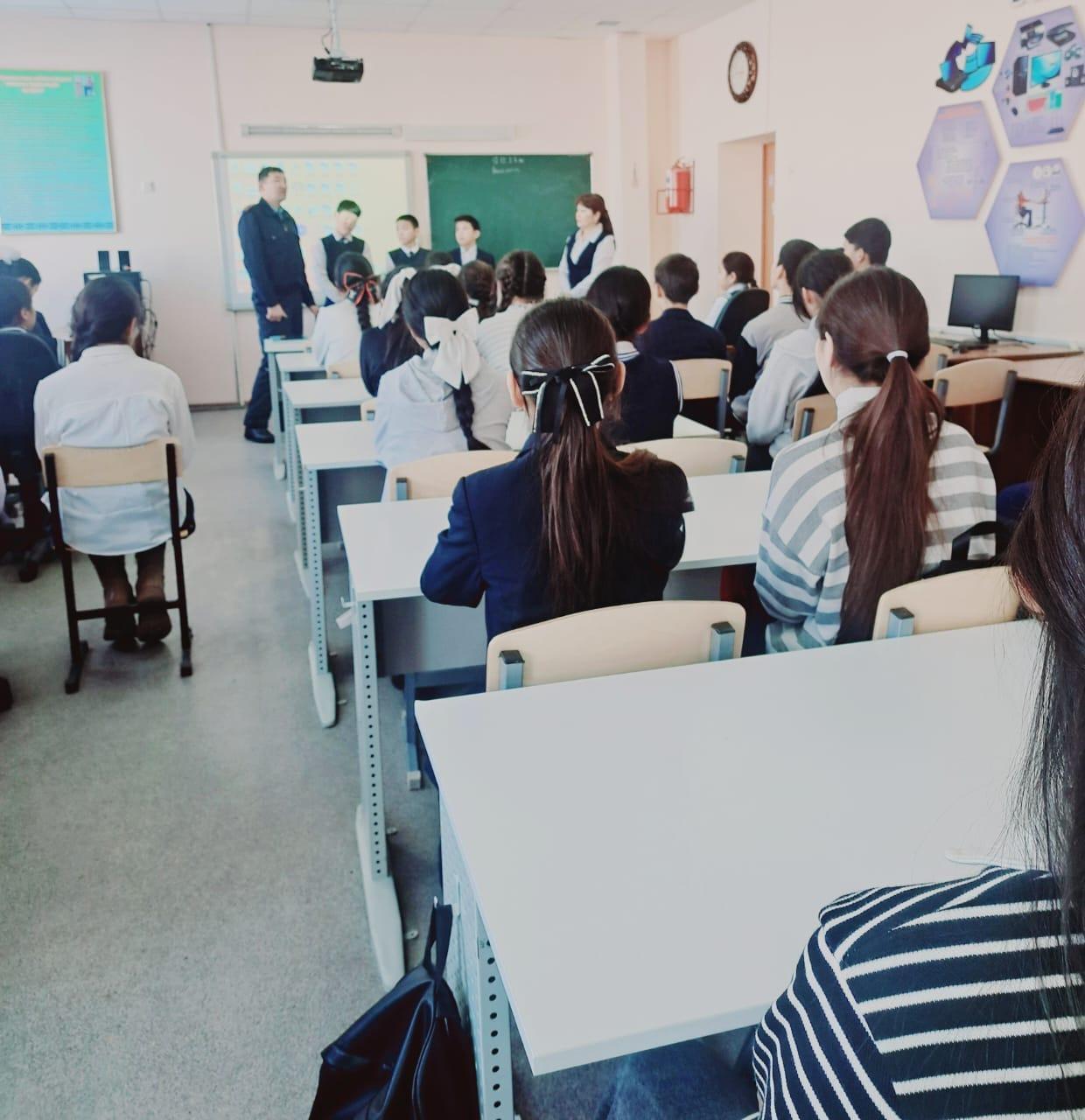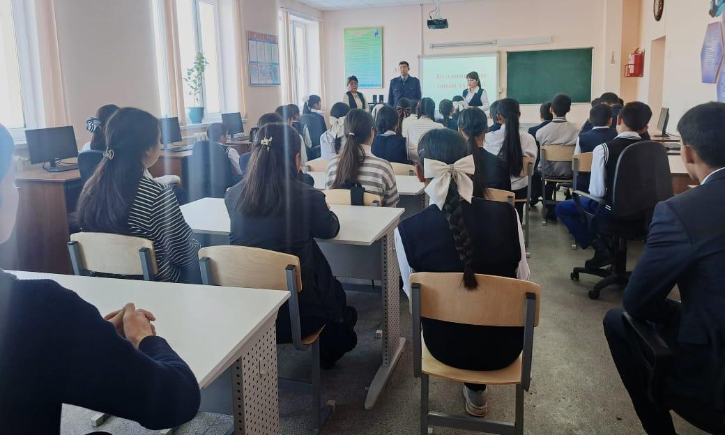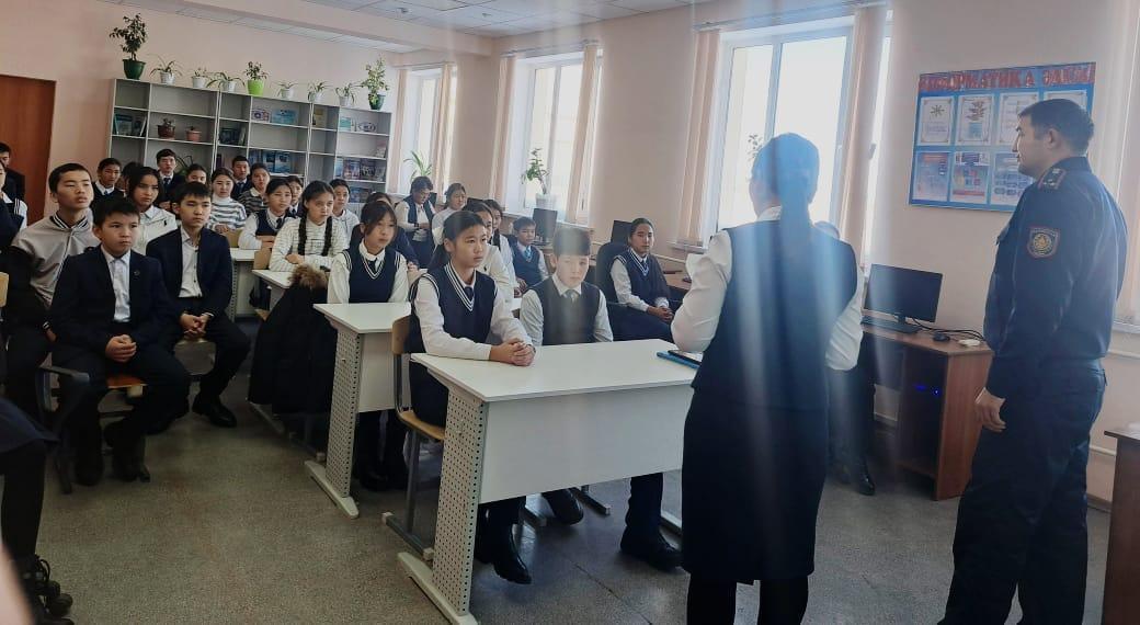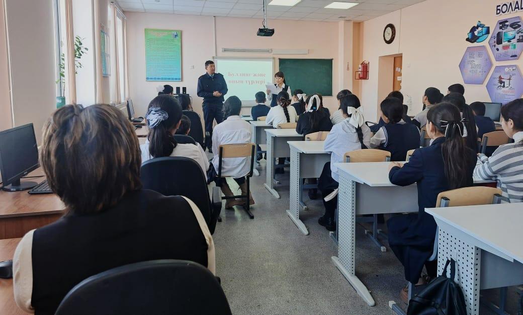 Әлия Молдағұлова атындағы орта мектебінде 12.12.2023ж күні директордың тәрбие ісі- жөніндегі орынбасары Ш. С. Илкибаева мен мектеп психологы Жауғашева Гауһар Тасболатқызының ұйымдастыруымен Шу АПБ ЖПҚБ ЮПТ УПИ полиция аға лейтенант Иманбаев Қырықбай Жақсылықұлы 7-11 сынып білім алушылар арасында жасөспірім кезеңіндегі кездесетін буллингтің түрлері, себептерін анықтау, қиындықтардың және оның алдын алу жұмысын жүргізу, буллинг туралы ақпаратты кеңейту мақсатында "Буллинг және оның түрлері" тақырыбында психолог түсіндірме жұмысын жүргізді, мектеп инспекторы тарапынан заң аясында түсіндіріп өтті.
